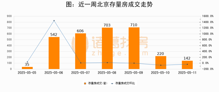 从存量房来看,2025年05月11日北京存量房单日成交142套,比昨日减少78套,环比下降35.4%。从近一周存量房成交来看,北京存量房日均成交套数为422套,05月11日单日成交142套,低于近一周平均水平66.4%。