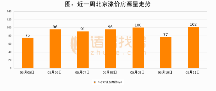 根据诸葛找房数据显示,北京24小时涨价房源量为102套,较05月10日增加25套,环比上涨32.5%。与此同时,涨价房源占比小幅扩大,业主信心有所提升。