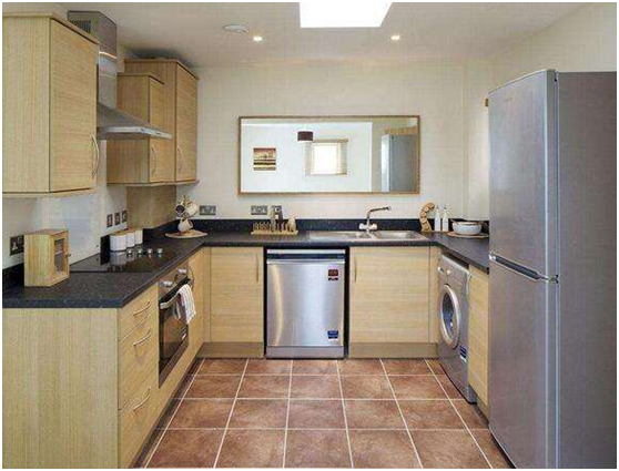 注意事项:尽量避免用马赛克和小型号瓷砖来铺设地面,这样不利于厨房的打扫和清洁。