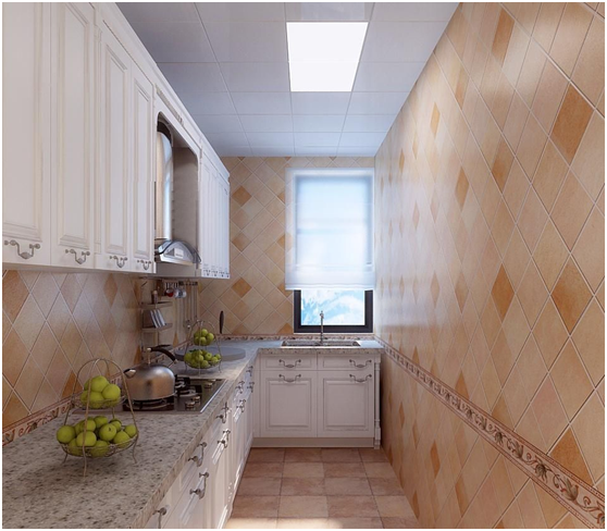 釉面砖——是最适合厨房墙面的瓷砖。它比抛光砖的色彩亮,样式较多,并且釉面砖的去污效果更好,更适合油烟重的厨房。同时釉面砖的吸水率低,且强度很高,能防止到细菌的生长。