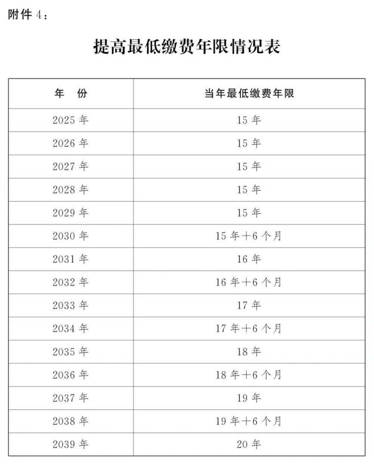 第二条 从2030年1月1日起,将职工按月领取基本养老金最低缴费年限由十五年逐步提高至二十年,每年提高六个月。职工达到法定退休年龄但不满最低缴费年限的,可以按照规定通过延长缴费或者一次性缴费的办法达到最低缴费年限,按月领取基本养老金。