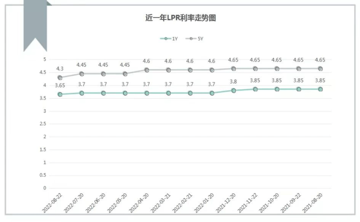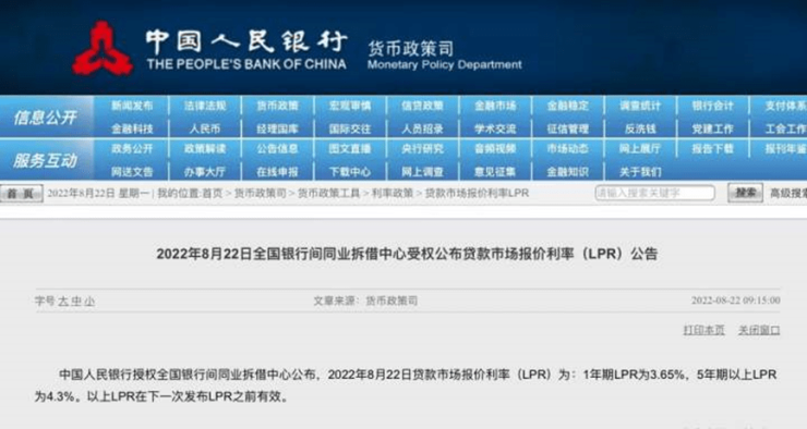 今日(8月22日),中国人民银行授权全国银行间同业拆借中心公布较新一期LPR,一年期贷款市场报价利率(LPR)为3.65%,对比上月下调5个基点;五年期贷款市场报价利率(LPR)为4.30%,对比上月下调15个基点。以上LPR在下一次发布LPR之前有效。
