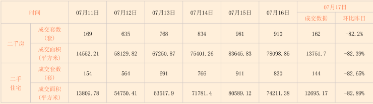 07月17日,北京市二手房成交162套,环比昨日下降82.2%,二手房成交面积13751.7㎡,环比昨日下降82.39% ;其中,二手住宅成交144套,环比昨日下降82.65%,二手住宅成交面积12695.17㎡,环比昨日下降82.89% 。
