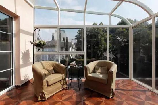 利用透明、半透明或者彩绘玻璃作为阳台顶面,优点是采光充分,视野开阔,给人清新而开朗的体验。缺点是清洁难度较大,长期日晒雨淋下使用寿命会受影响。