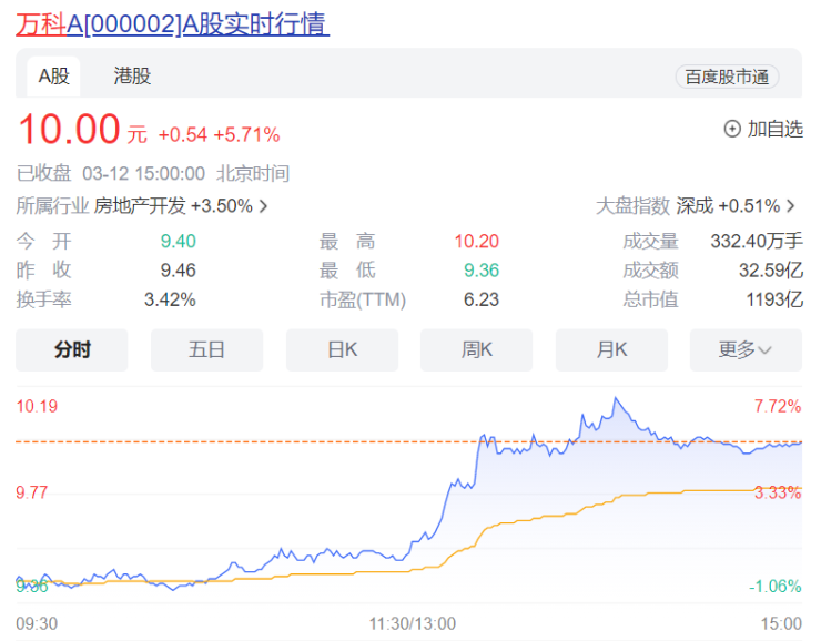 月12日午后,万科A股、H股及多只债券大幅拉升,万科A盘中一度涨近8%。截至当日收盘,万科A(SZ000002,股价10.00元,市值1193亿元)报收10元/股,涨幅达5.71%;万科企业(HK02202,股价6.30港元,市值751.63亿港元)报收6.30港元/股,涨幅达10.33%。