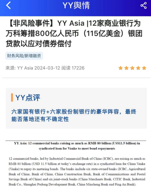 3月12日午间,YY评级发布消息称,有12家商业银行正在筹集高达800亿元(按当天汇率计算为115亿美元)的贷款,以帮助万科偿还到期债券。万科目前正在为符合条件的银团贷款准备担保,根据万科公共债券到期情况,银团贷款余额不超过500亿元。该消息在投资者之间引发高度关注和热议。