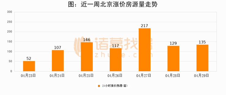根据诸葛找房数据显示,北京24小时涨价房源量为135套,较04月28日增加6套,环比上涨4.7%。与此同时,涨价房源占比小幅扩大,业主信心有所提升。