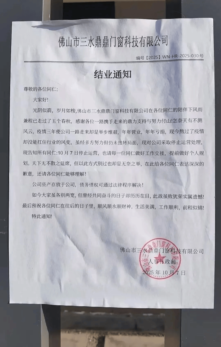 近日,佛山市三水鼎鼎门窗科技有限公司(下称“鼎鼎门窗”)正式发布结业通知,宣布因持续亏损、行业环境恶化,公司决定于10月7日起停止运营。