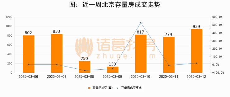 从存量房来看,2025年03月12日北京存量房单日成交939套,比昨日增加165套,环比上涨21.3%。从近一周存量房成交来看,北京存量房日均成交套数为649套,03月12日单日成交939套,高于近一周平均水平44.7%。