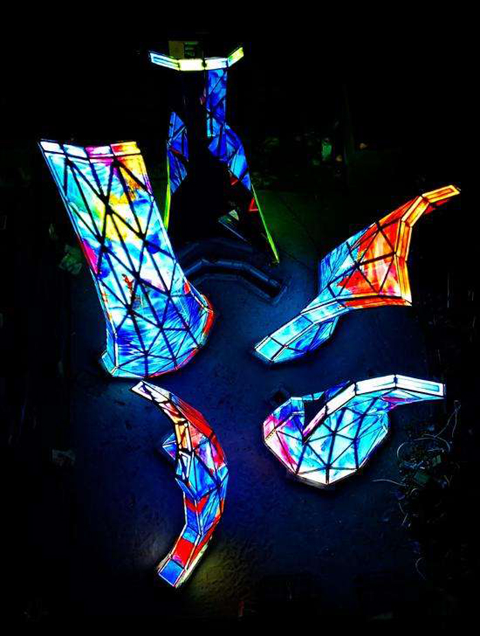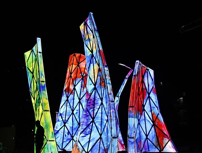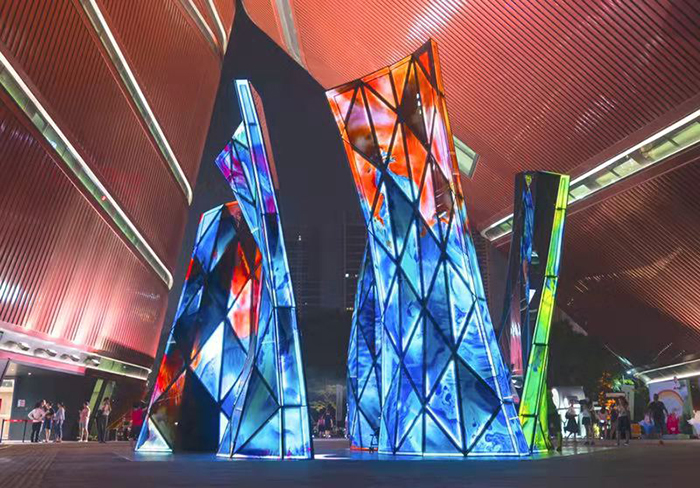 盛姗姗:作品《绽放》是国内罕见的采用开放式造型的公共艺术作品,并在国内首次使用了德国建筑艺术玻璃。我们在复杂的金属钢结构上缔造出8.8米高的大型玻璃雕塑。作品结合多媒体、原创音乐、灯光等元素,让公众进入其中。作品呈现三种不同的模式:排名前列种是白天雕塑静态审美模式。第二种是《绽放》夜晚的定时“音乐表演”模式,播放由意大利作曲家原创的两首曲子和意大利著名电影配乐大师埃尼奥·莫里康内(Ennio Morricone)为《开放的长城》(Open wall)所谱的一首曲子。这是联合国教科文组织的大型电影《地球-我们的家园》的第八章Open wall。音乐与灯光的变幻使雕塑呈现出动感的活力。第三种则是夜晚的“自定义艺术”观众互动模式,通过扫描二维码,在手机端操控声音和灯光,与作品进行互动,带来“沉浸式”感官体验。