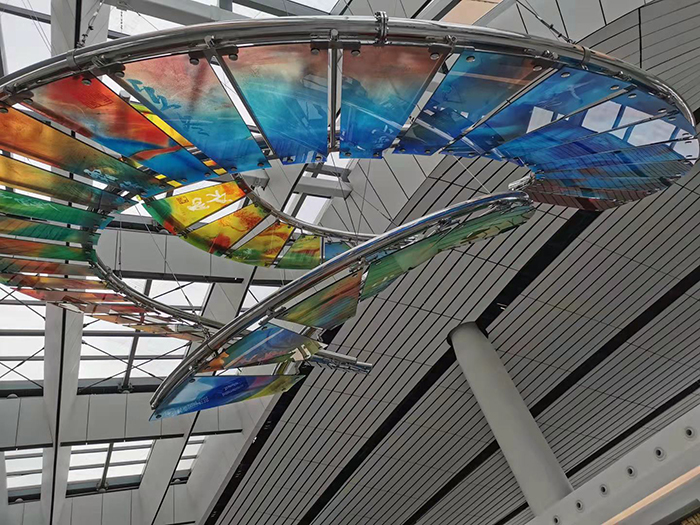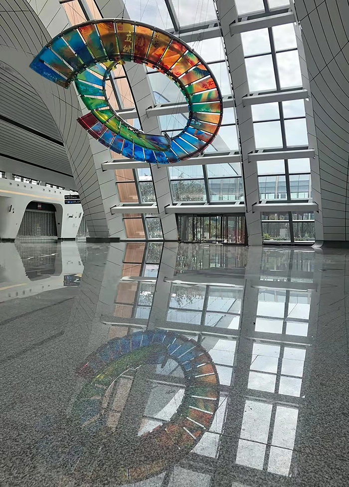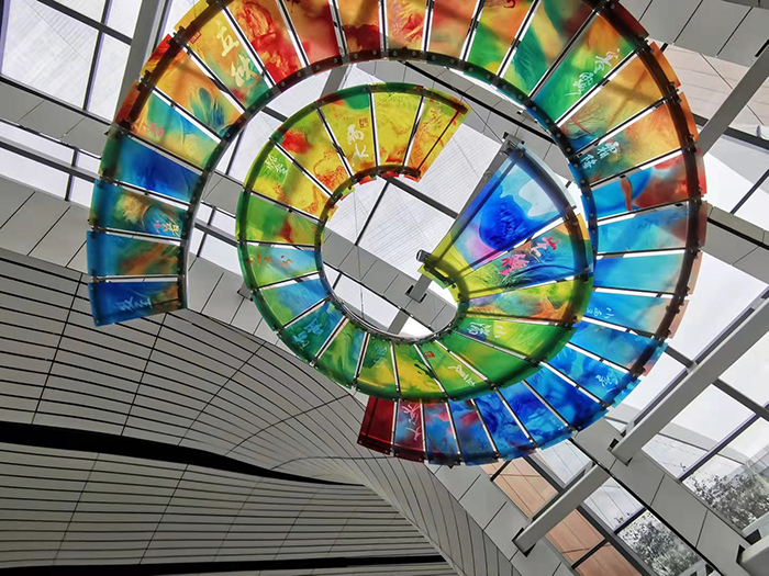 盛姗姗:在这件作品里,每两片玻璃上绘制一幅代表一个节气的画面,近50片艺术玻璃回旋排列、盘旋上升,其连续的曲线轮廓如同天空、宇宙、河流......代表了二十四节气在时空中的交替变化,以及历史长河中流淌着的中国传统文化精髓。由于悬挂在空中,整件作品在不同角度光照下呈现出生动的气韵。我们还根据万年历和二十四节气的变化,设置了多媒体灯光投射。到某个节气时,机场的旅客可以看到作品对应的局部会发出亮光,如同一个缓慢的时钟告诉人们节气的到来。