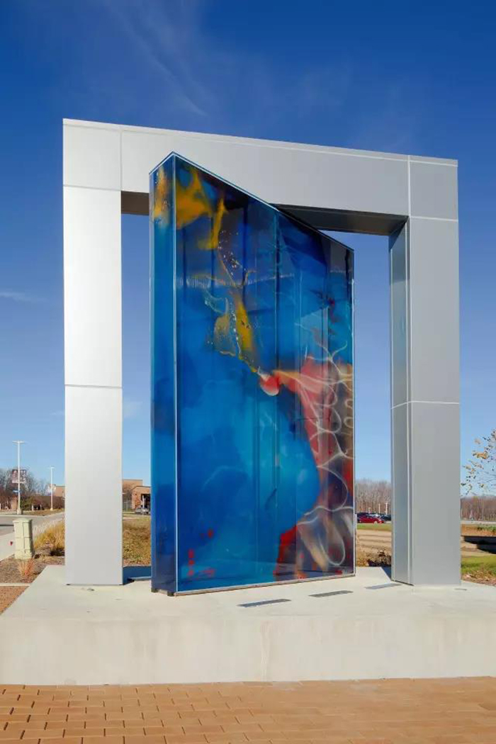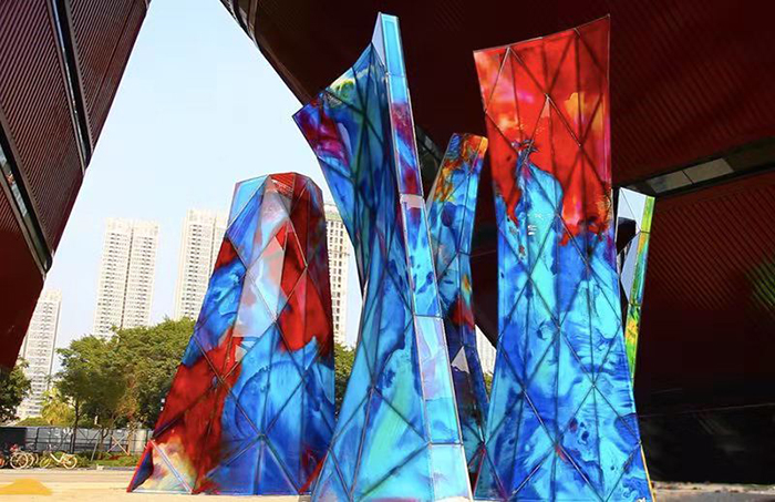 盛姗姗:艺术玻璃能够把绘画转化到空间中。并且这种材料较能表现她以色彩和抽象为主的绘画语言,而钢铁、大理石或不锈钢等材料难以做到这点。但是用玻璃来做大型的公共艺术作品,从制作工艺、运输到安装,难度都比较大。而能够制作大型艺术作品所用玻璃的工作室,在全世界也屈指可数。不过我也在一些作品中尝试将竹、青铜器、书法等中国元素和抽象艺术的观念相结合,试图用独特的艺术语言,给予公众对于传统文化的信心。
