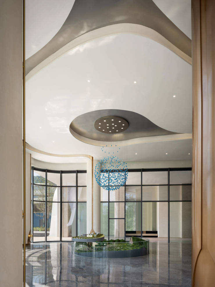 “水”成为串联起整个空间的清弦。拟态的水滴、水流、水景,静态中蕴藏流动的美感。配合着一日光影在空间里变化生姿,更显生动的自然韵律。