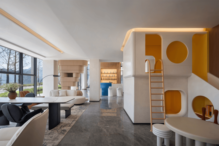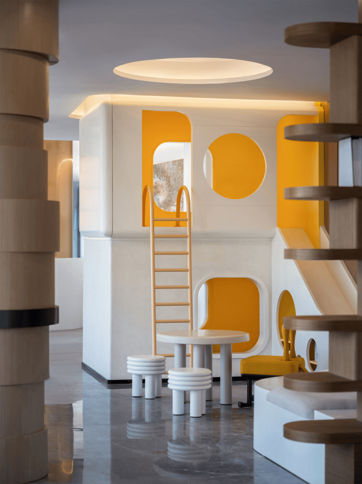为满足不同群体的需求,空间还设置了特色鲜明的功能分区,儿童活动区,树屋造型的滑梯通过简约几何造型与明快黄色的点缀,一方面展现儿童趣味,另一方面,也与空间色调相照应,做到儿童友好与空间之美的结合。