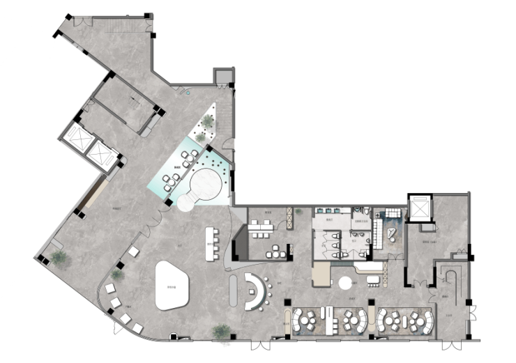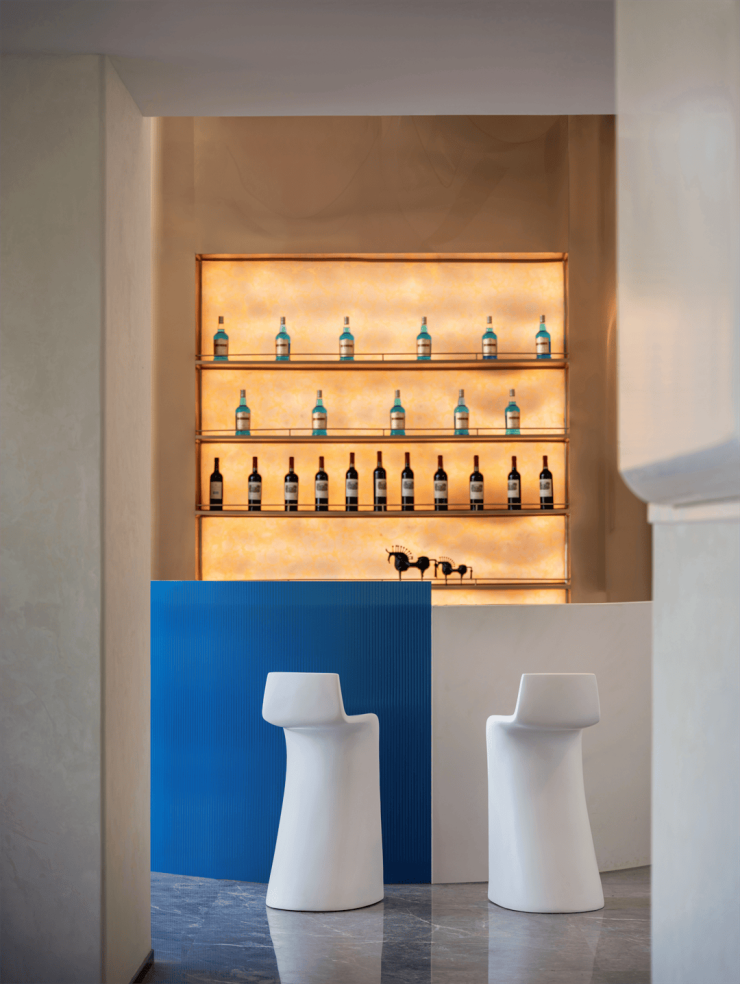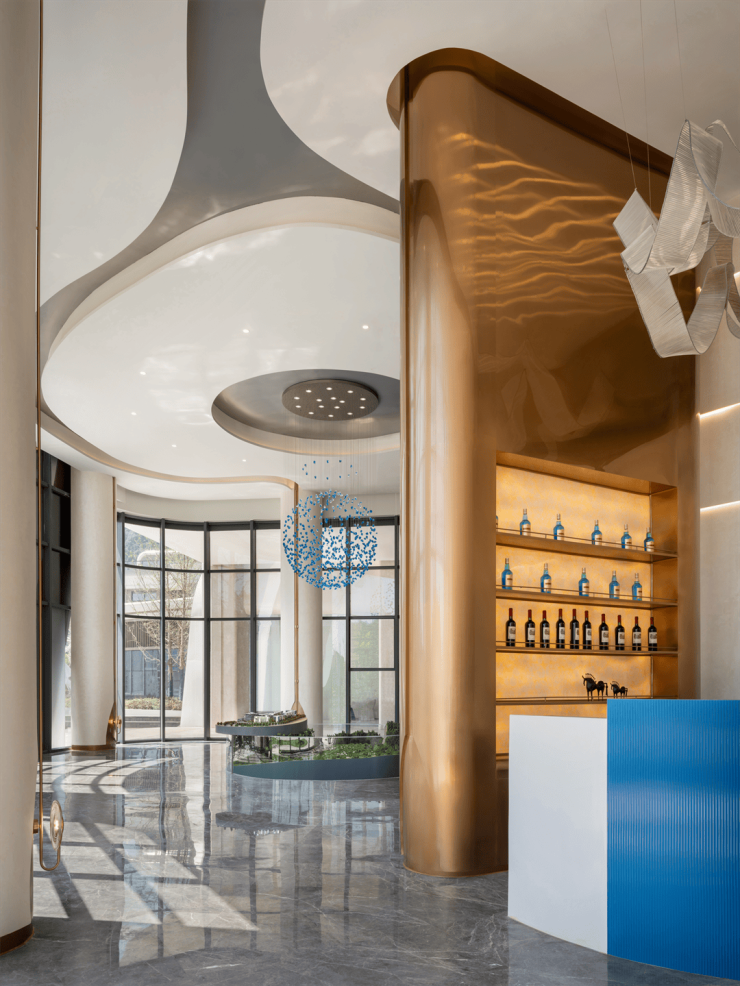 统一的浅米灰色调贯穿空间。水吧区域除了保留挑空区域的原始层高与结构关系,形成简洁清晰的视觉链接之外,更通过古铜色饰面在光照射下显出浮光跃金之美,翩然舞动的银白色装置轻盈灵动,延续“水”的意象与色彩的吧台,更是将这种自然层次醒目点题,也多了色彩上的悦动,避免单调。