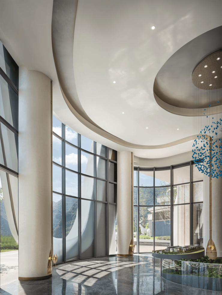 设计师本着打造销售与体验双重功能出发,从周边奇山碧水中汲取灵感,将壮丽的山川之势与灵动的流水之韵巧妙注入空间设计之中,创造出松弛、艺术,并独具韵味的"山水叙事空间"。