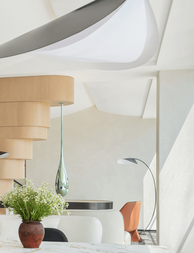 不规则排列的立柱灯消弭边界,为非方正结构的空间增添更多流动的艺术感。螺旋状的植物球悬垂其间,似"飞湍瀑流争喧豗"后的一抹幽静,又如"草木蔓发,春山可望"的生机盎然。众多造型装置碰撞自然脉络,让空间焕发灵动张力。