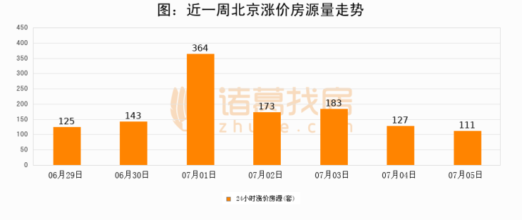 根据诸葛找房数据显示,北京24小时涨价房源量为111套,较07月04日减少16套,环比下降12.6%。与此同时,涨价房源占比小幅回落,对于购房者来说是一个入市窗口期,购房者可抓住时机入市。