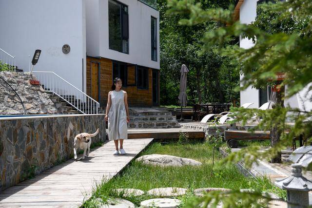 7月21日,在兴隆县雾灵山镇一家民宿,游客在庭院内休闲。新华社发(王立群 摄)