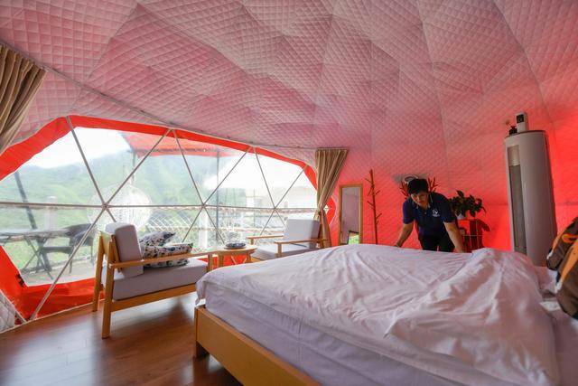 7月21日,在兴隆县雾灵山镇一家民宿,工作人员周桂君在整理房间。新华社发(王立群 摄)