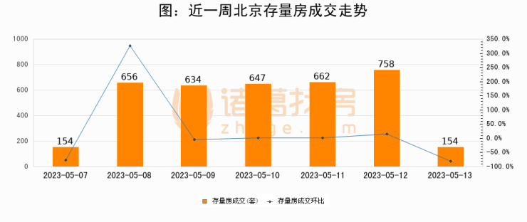 从存量房来看,2023年05月13日北京存量房单日成交154套,比昨日减少604套,环比下降79.7%。从近一周存量房成交来看,北京存量房日均成交套数为523套,05月13日单日成交154套,低于近一周平均水平70.6%。