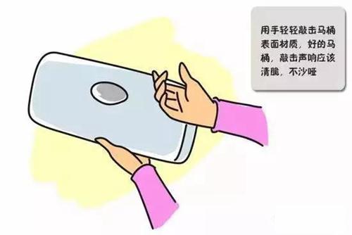 测试方法:用手轻轻敲击马桶,如果声音沙哑,不清脆响亮,很可能有内裂,或是产品没有烧熟。