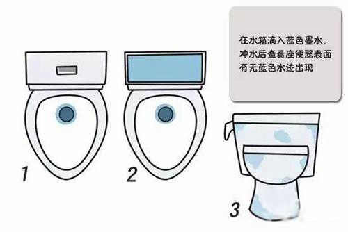测试方法:在马桶水箱内滴入蓝墨水,搅匀后看马桶出水处有无蓝色水流出,如有则说明马桶有漏水的地方。