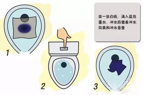 测试方法:在马桶内放入一张白纸,滴入几滴蓝墨水,待纸张染成蓝色后冲水,看马桶是否冲水彻底,同时听冲水静音效果是否良好。
