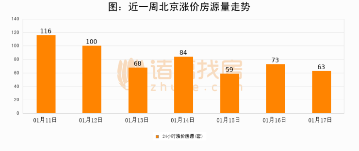 根据诸葛找房数据显示,北京24小时涨价房源量为63套,较01月16日减少10套,环比下降13.7%。与此同时,涨价房源占比小幅回落,对于购房者来说是一个入市窗口期,购房者可抓住时机入市。