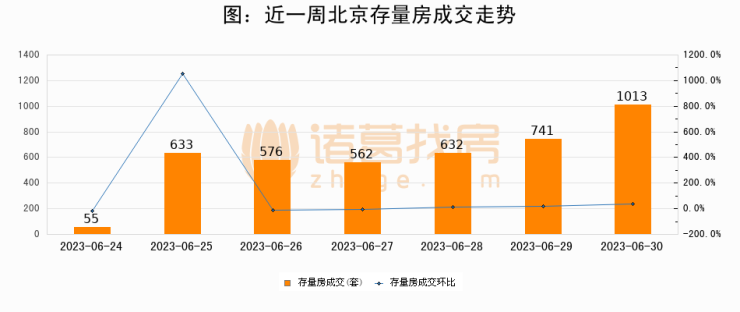 从存量房来看,2023年06月30日北京存量房单日成交1013套,比昨日增加272套,环比上涨36.7%。从近一周存量房成交来看,北京存量房日均成交套数为601套,06月30日单日成交1013套,高于近一周平均水平68.6%。