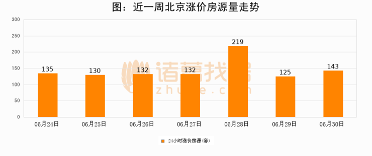 根据诸葛找房数据显示,北京24小时涨价房源量为143套,较06月29日增加18套,环比上涨14.4%。与此同时,涨价房源占比小幅扩大,业主信心有所提升。