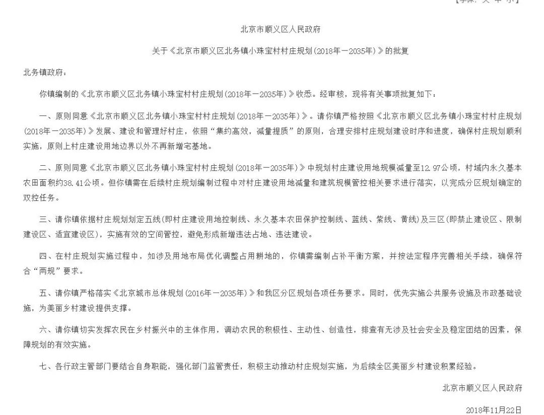 关于《北京市顺义区北务镇小珠宝村村庄规划(2018年—2035年)》的批复