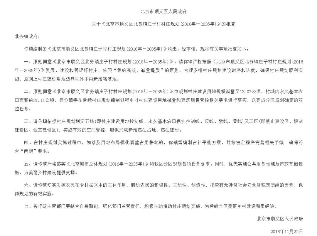 关于《北京市顺义区北务镇庄子村村庄规划(2018年—2035年)》的批复