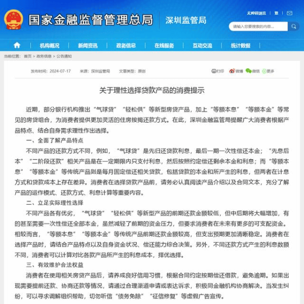 7月17日,国家金融监督管理总局深圳监管局发布了关于理性选择贷款产品的消费提示,指出部分银行机构为满足不同消费者的需求,推出了包括“气球贷”、“轻松供”在内的新型房贷产品,与传统的“等额本息”、“等额本金”还款方式形成互补,为消费者提供了更加灵活的住房按揭还款选择。
