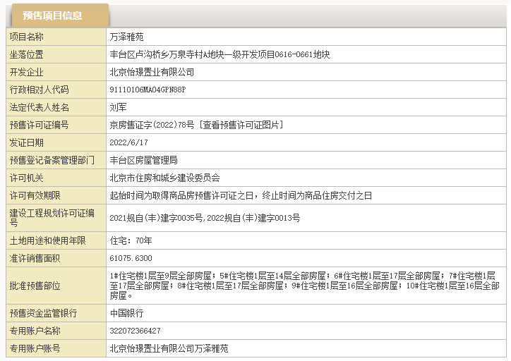 北京市住建委官网信息显示,端礼著(万泽雅苑)获预售许可证,准许销售面积61075.6300㎡,详情如下: