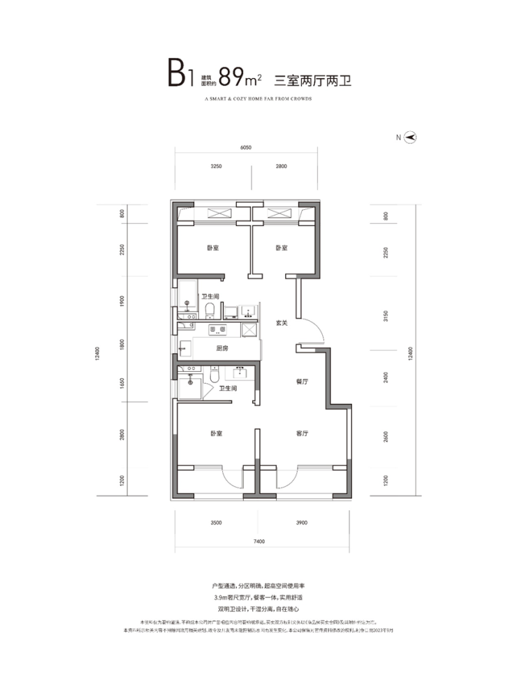 89㎡爆款三居实用率高达90%以上。客厅宽达3.9米宽,这在小三居里实属难得。餐客一体化,增强家人交流互动。L型厨房动线合理,烹饪美食更加便捷高效。