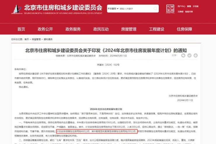 5月11日,北京市住建委发布《2024年北京市住房发展年度计划》。根据计划,今年计划供应配租型和配售型保障性住房用地200公顷,计划供应商品住房约600万平方米。