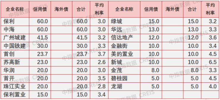 备注:规模单位为亿元,海外债按当月最后一天汇率换算为人民币,利率单位为% (数据来源:中指数据CREIS)