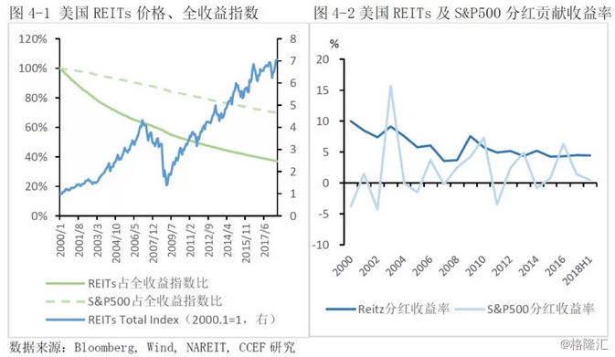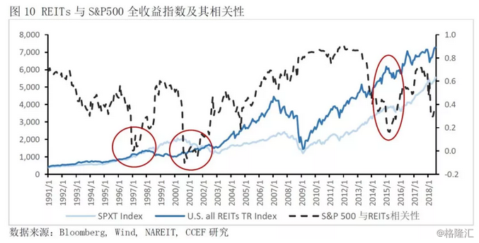 REITs收益由价格变动及分红所组成,在绝大多数年份,其年度收益高于美股普通权益资产。数据显示,在过去的18年中,美国REITs年收益率仅有4年低于以标普指数代表的权益类资产,此外,在2003-2007、2009至今两轮股市上涨周期中,投资REITs的年化收益分别为32%、23%,而同期投资标普指数则为17%、21%。若是以含分红再投资的全收益指数为标准,在两轮上涨周期中,投资REITs的累计涨幅分别为200%、420%,而同期标普累计涨幅分别为90%、350%。