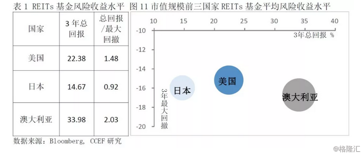 从全球REITs市场来看,海外REITs基金较近3年(2015.8—2018.8)总回报均值约为23.97%,期间较大回撤平均在15.84%,回报/较大回撤比值为1.51。海外REITs市场规模较大的三个国家分别为美国、日本、澳大利亚,选取具有代表性15只REITs基金的平均表现,作为衡量该市场整体的风险收益情况。数据显示,美国作为全球较大的REITs市场,其REITs基金近3年表现稳定,总收益约为22.38%,处于海外REITs基金收益表现的平均水平;澳大利亚市场整体规模虽较小,但其具有更高的收益回报,且作为衡量风险的回报/较大回撤比值仅稍高于美国,可作为除美国外海外REITs基金投资的优质选择。