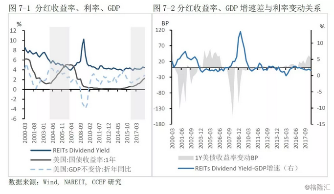 数据表明,利率的变化和REITs的的分红收入之间存在较弱的负相关性,利率下降,经营成本下降,利率上升,经营成本也随之上升,但利率上升通常伴随着经济快速增长,REITs的经营收入也会相应上升,因此,利率变化对REITs分红收入有影响,但影响较弱。这也是当前REITs分红收益仍保持稳定的原因。可以说,利率、经济环境共同影响REITs的分红收益。
