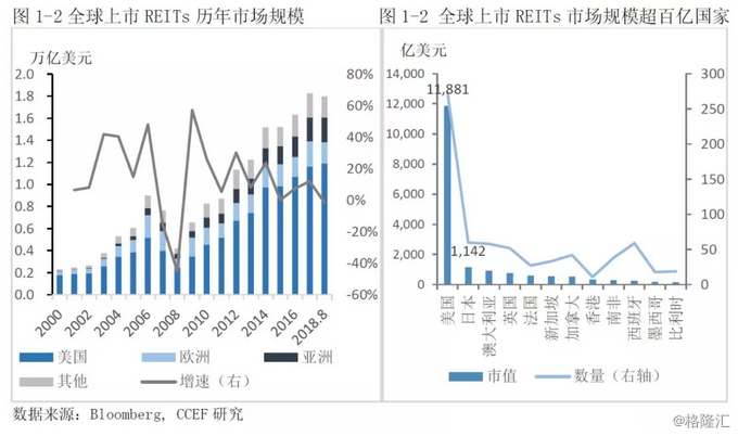 自1960年诞生以来,目前全球已有37个国家或地区设立相关法规并建立REITs。美国作为REITs较成熟市场,无论在数量上还是规模上均占全球主导地位,截至2018年8月,美国上市REITs估值1.19万亿美元,占全球REITs总规模的65.7%。
