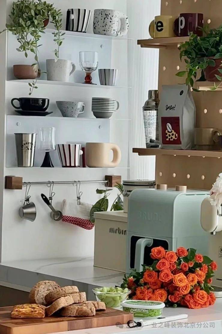 再比如,厨房可以使用隔板、置物架、洞洞板,让锅碗瓢盆、瓶瓶罐罐能上墙的都上墙。