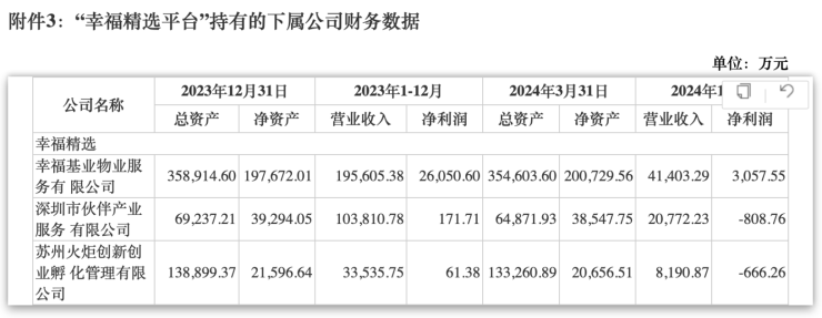 “幸福精选平台”持有包括公司及下属公司持有的:幸福基业物业服务有限公司100%股权、深圳市伙伴产业服务有限公司60%股权、苏州火炬创新创业孵化管理有限公司51%股权。