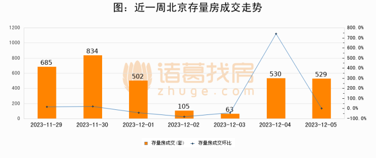 从存量房来看,2023年12月05日北京存量房单日成交529套,比昨日减少1套,环比下降0.2%。从近一周存量房成交来看,北京存量房日均成交套数为464套,12月05日单日成交529套,高于近一周平均水平14%。