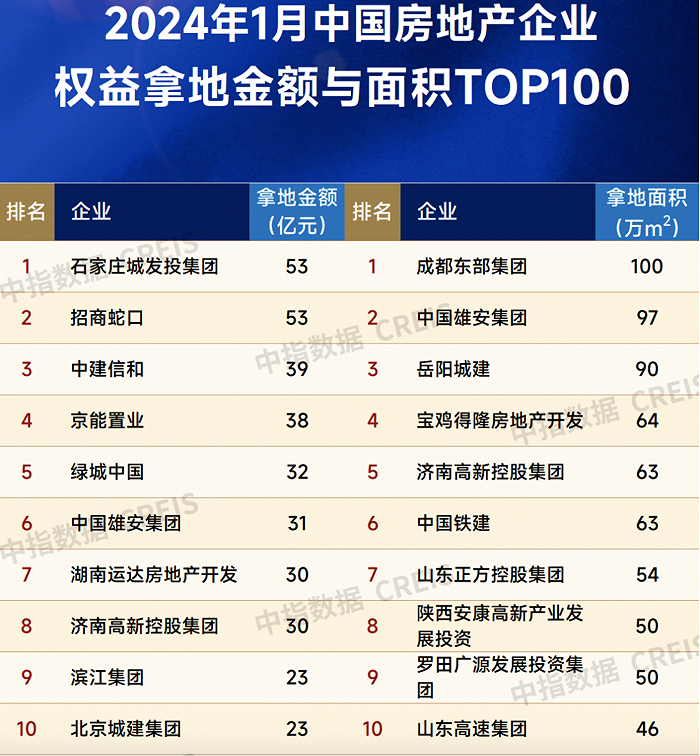 其中,拿地金额排名前五的企业为:石家庄城发投集团、招商蛇口、中建信和、京能置业和绿城中国,拿地金额分别为53亿元、53亿元、39亿元、38亿元和32亿元。
