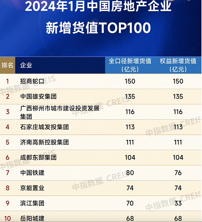 在新增货值方面,招商蛇口和中国雄安集团位列前两位,新增货值规模分别为150亿元和135亿元。TOP10房企的新增货值总额1022亿元,占TOP100房企的29.7%。TOP100新增货值门槛为14亿元,较去年同期提升6亿元。