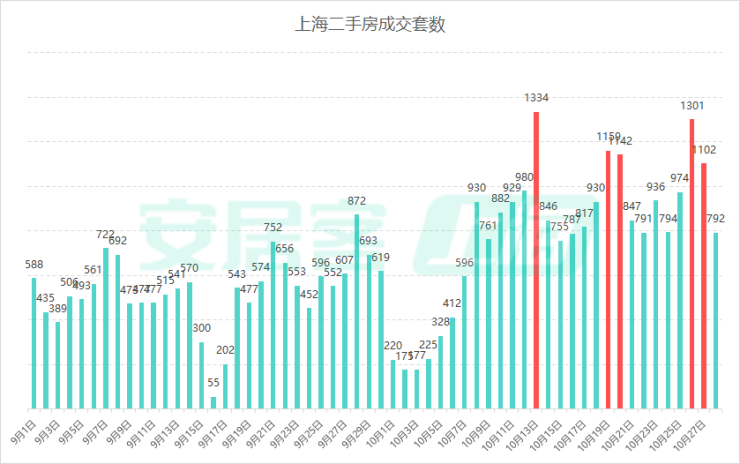 根据安居客上海监测数据,10月26日当天成交1301套,创下二手房单日成交量的年内第二高;10月27日成交1102套,为月内第五次、年内第11次成交突破千套大关。节后三周的周末(共计六天),二手房成交量已达到7018套,日均成交高达1170套,显示出市场的高度活跃。