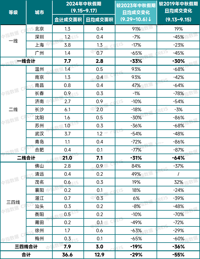 根据中指研究院监测数据,今年中秋假期期间,25个代表城市新房日均销售面积较2023年假期下降约29%(注:由于2023年中秋和国庆假期连休,与去年对比时选择连休假期日均成交做对比)。