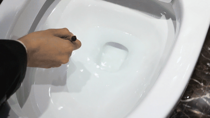 拿出道具,开始测试。小编在马桶内壁用蓝墨水涂了一圈,静待几分钟后,按下冲水按钮,可以看到,墨水渍被冲洗得一干二净,并无残留。